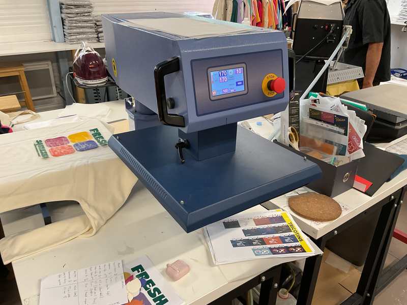 Voir les 5 photos: Presse à chaud (machine)/ Paramètre de la presse à chaud, temps et température/ Utilisation de la presse à chaud/ Avant passage à la presse à chaud/ Après passage à la presse à chaud