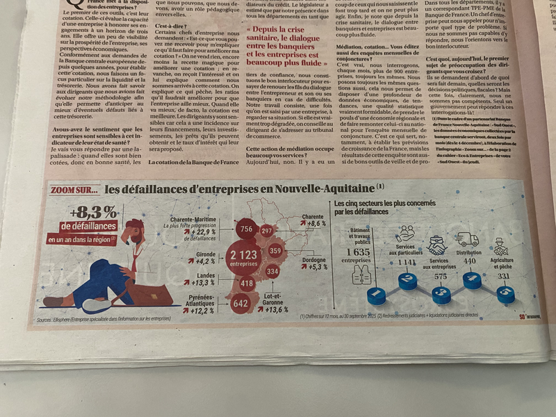 Travail réalisé pour la rubrique “Eco et Entreprise”, intitulé “Zoom sur… les défaillances d’entreprises en Nouvelle-Aquitaine publié dans le journal du 26 novembre 2025.